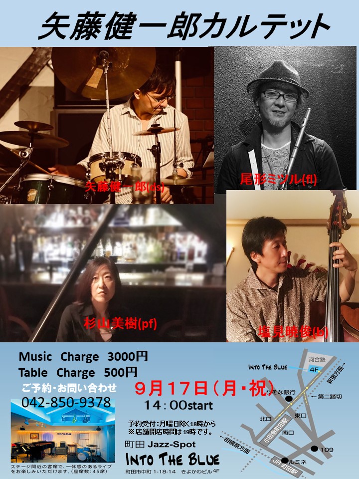 町田INTO THE BLUE 9月17日 14時 矢藤健一郎カルテットです。ドラム矢藤健一郎