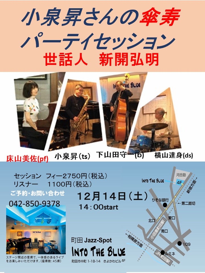町田INTO THE BLUE 12月14日 14時から小泉ノボさんの傘寿パーテイセッションです。ノボさん、傘寿=80歳を迎えてもますます元気です。小泉ノボさんの傘寿をみんなで
