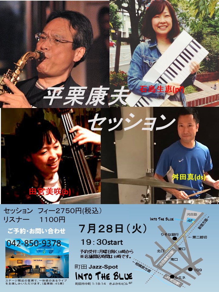 町田INTO THE BLUE 7月27日 月曜日 バイソン片山 トリオ ライブ&セッションです。